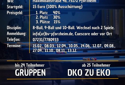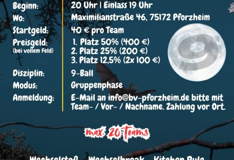 Jeden ersten Samstag im Monat veranstalten wir unser BV Pforzheim Multiball Hausturnier. Bitte melde Dich unter dem jeweiligen Turnier bei Billardverein Pforzheim e.V. (cuescore.com) oder per E-Mail an info@bv-pforzheim.de an.